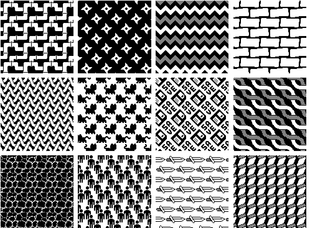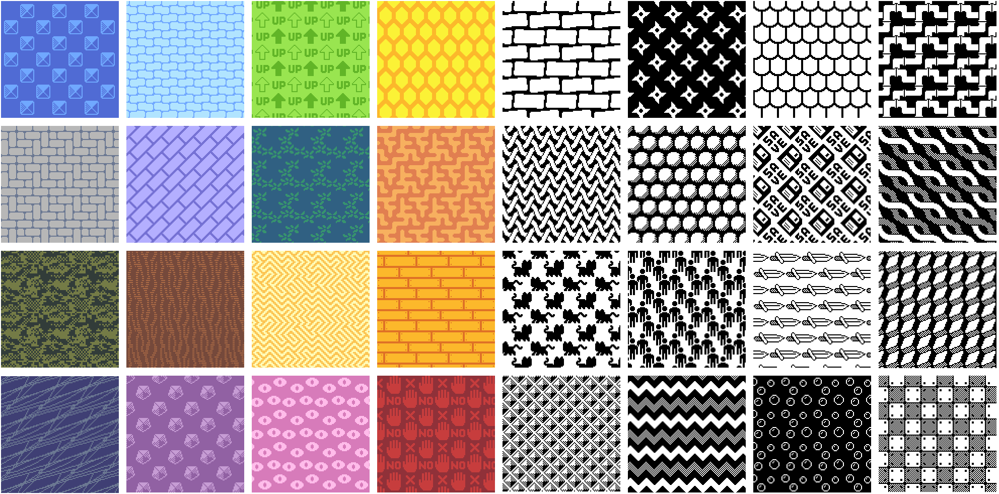 Collection of 225 free textures. Each sprite has strictly two colors and a size of 32x32.